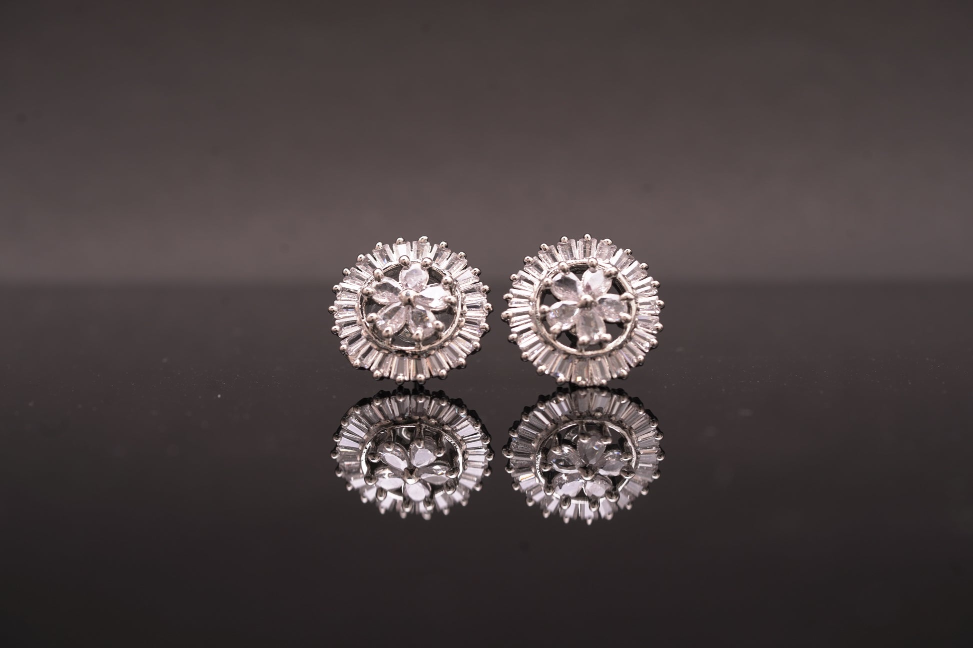 These elegant ear studs showcase authentic American diamonds arranged in a floral pattern, complemented by baguette-cut American diamonds. Add a touch of timeless sophistication and allure to your appearance with these stunning studs.