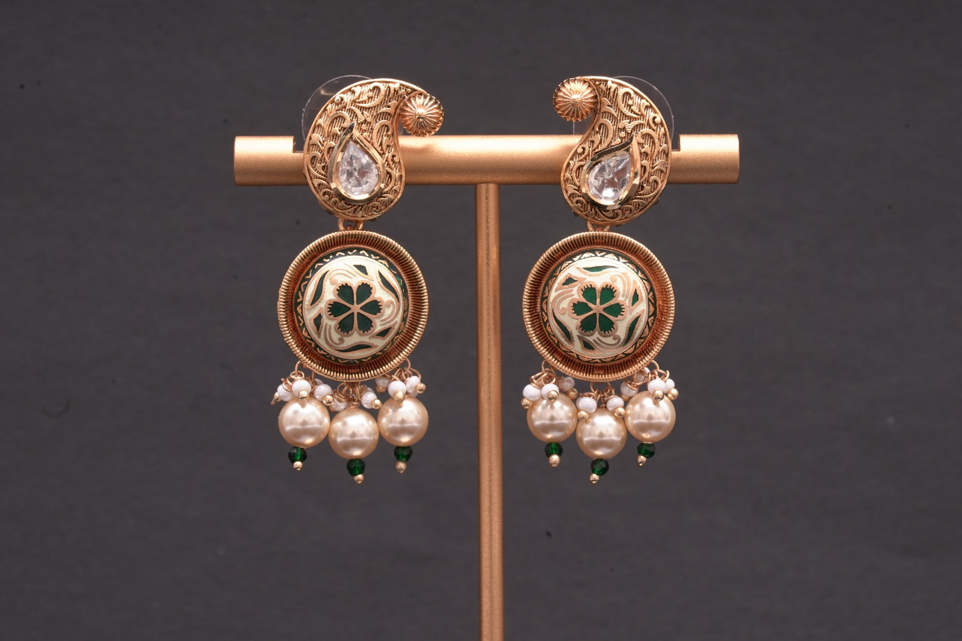 This elegant piece showcases expert craftsmanship, blending polki work in an intricate ambi pattern at its base with stunning white and green enamel work finished with a delicate string of pearls expertly hanging at the bottom. Finished in an exquisite gold finish, these earrings are the perfect complement to your unique style.