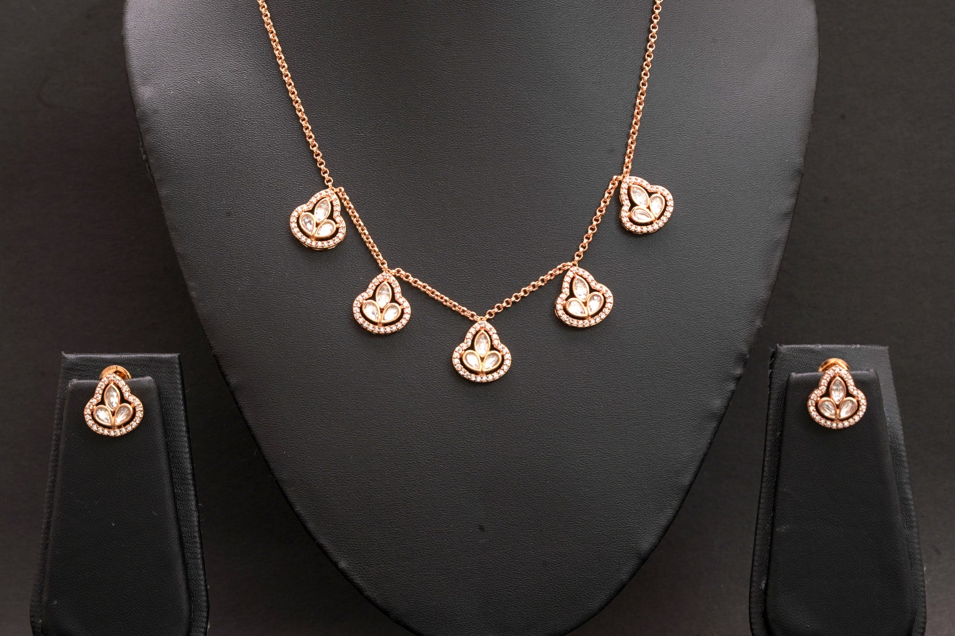 This pendant chain features clover leaf pendants adorned with polki stones and encased in classic American diamonds set in a classic gold finish. The set also includes matching clover-shaped earrings, making it a stylish, versatile addition to your accessories collection. Perfect for any occasion, this set adds an elegant touch to any outfit.