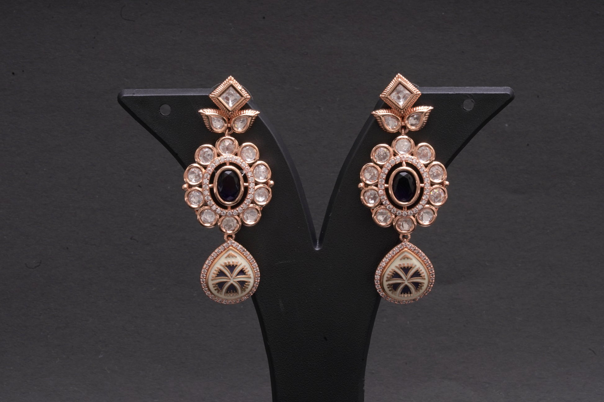 These stunning danglers are pinnacle of Indian design and craftsmanship. They are crafted with a statement, black stone in the middle ensconced with stone polkis finished with enamel work tear drop at the end. With a radiant, rose gold finish, these earrings are sure to add a touch of glamour and mystique to your look.