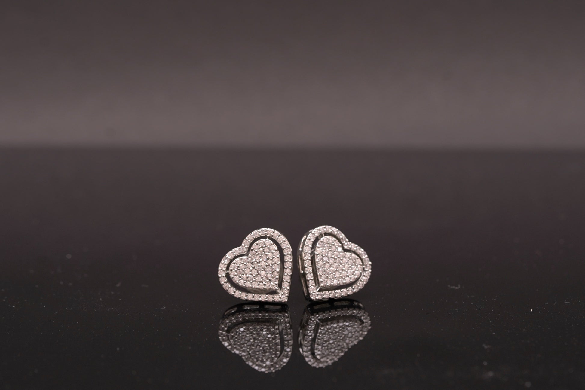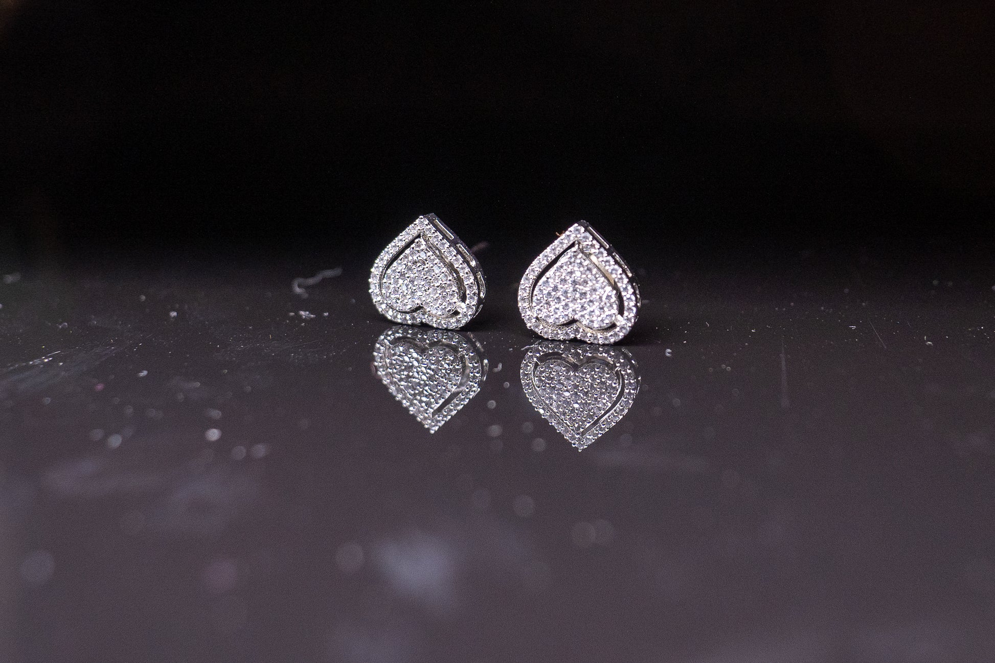 Delicate heart shaped ear studs in American diamond in white gold finish
