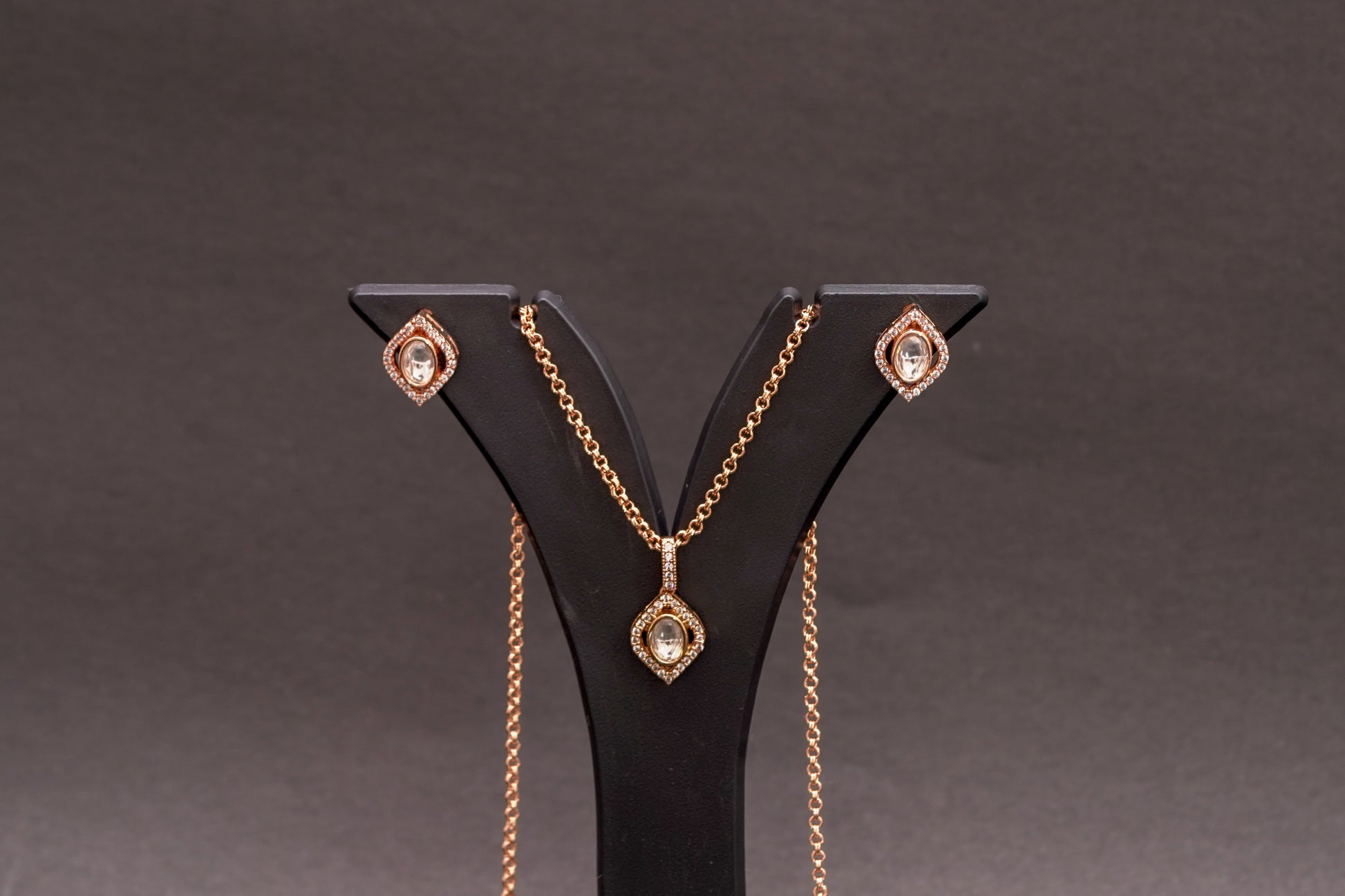 This is an elegant pendant set features a single polki stone, enhanced with authentic American diamonds and finished with a subtle gold tone. A versatile piece perfect for everyday wear, a first date, or any special occasion worth commemorating.