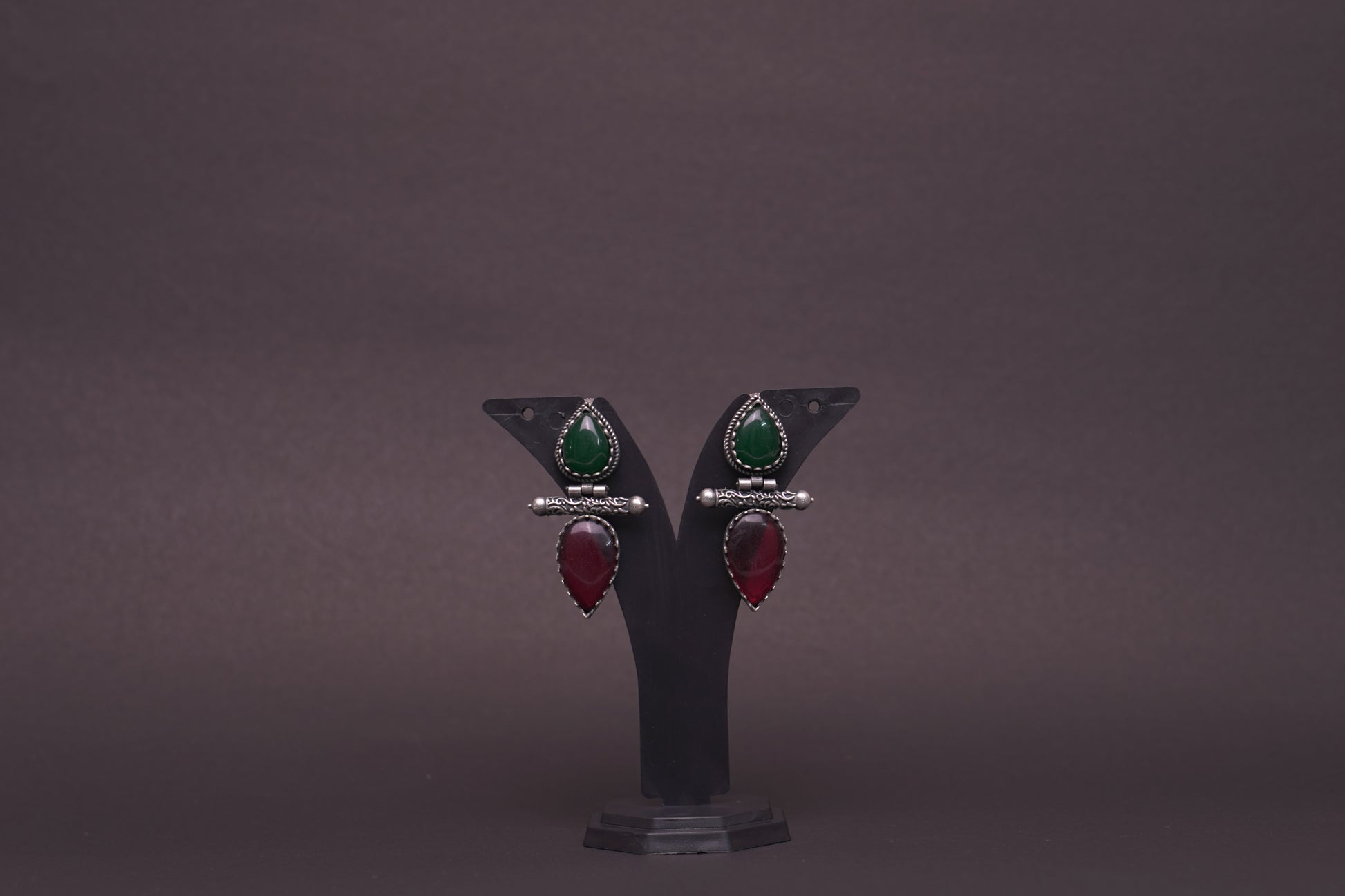Our dual tear drop earrings with red and green stone in silver finish feature a stunning tear drop design, crafted with blue stones and a silver finish. These earrings are fashionable and ideal for a chic, design-forward outfit.
