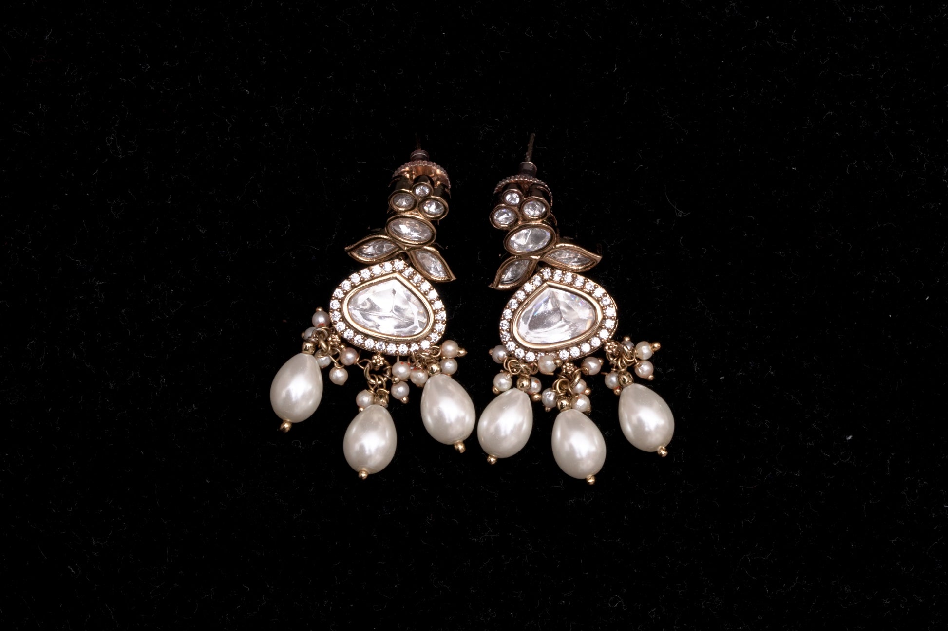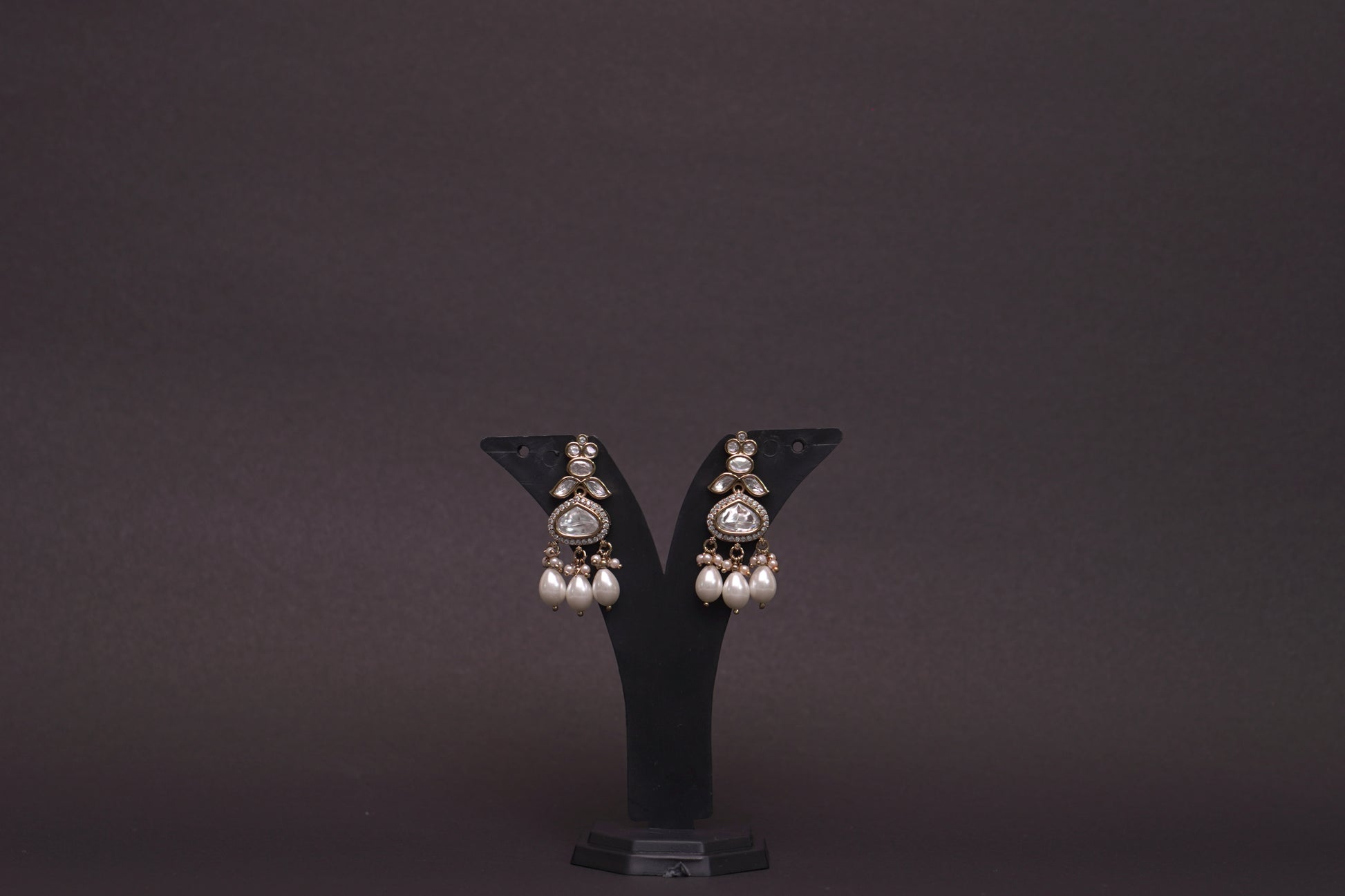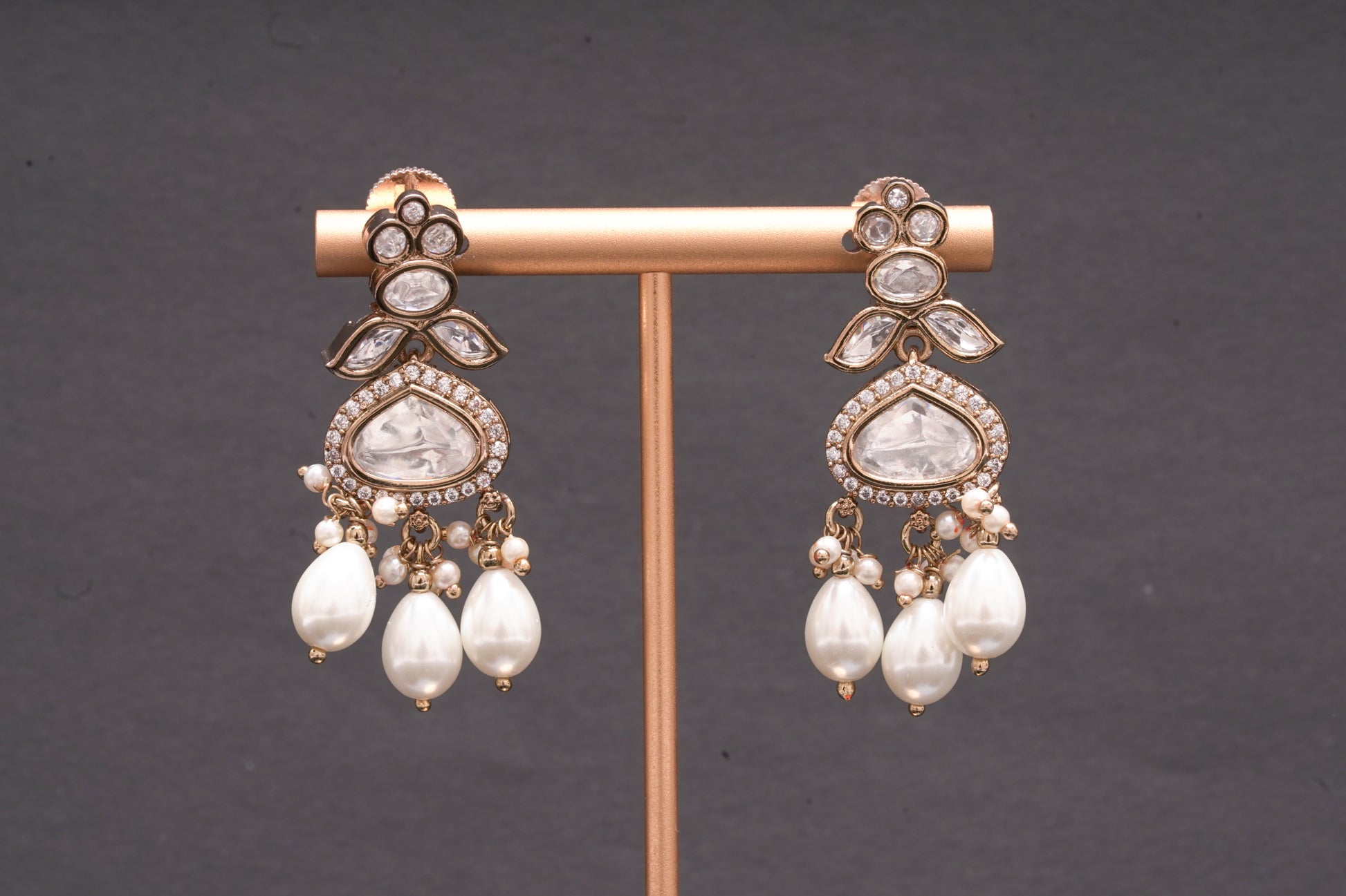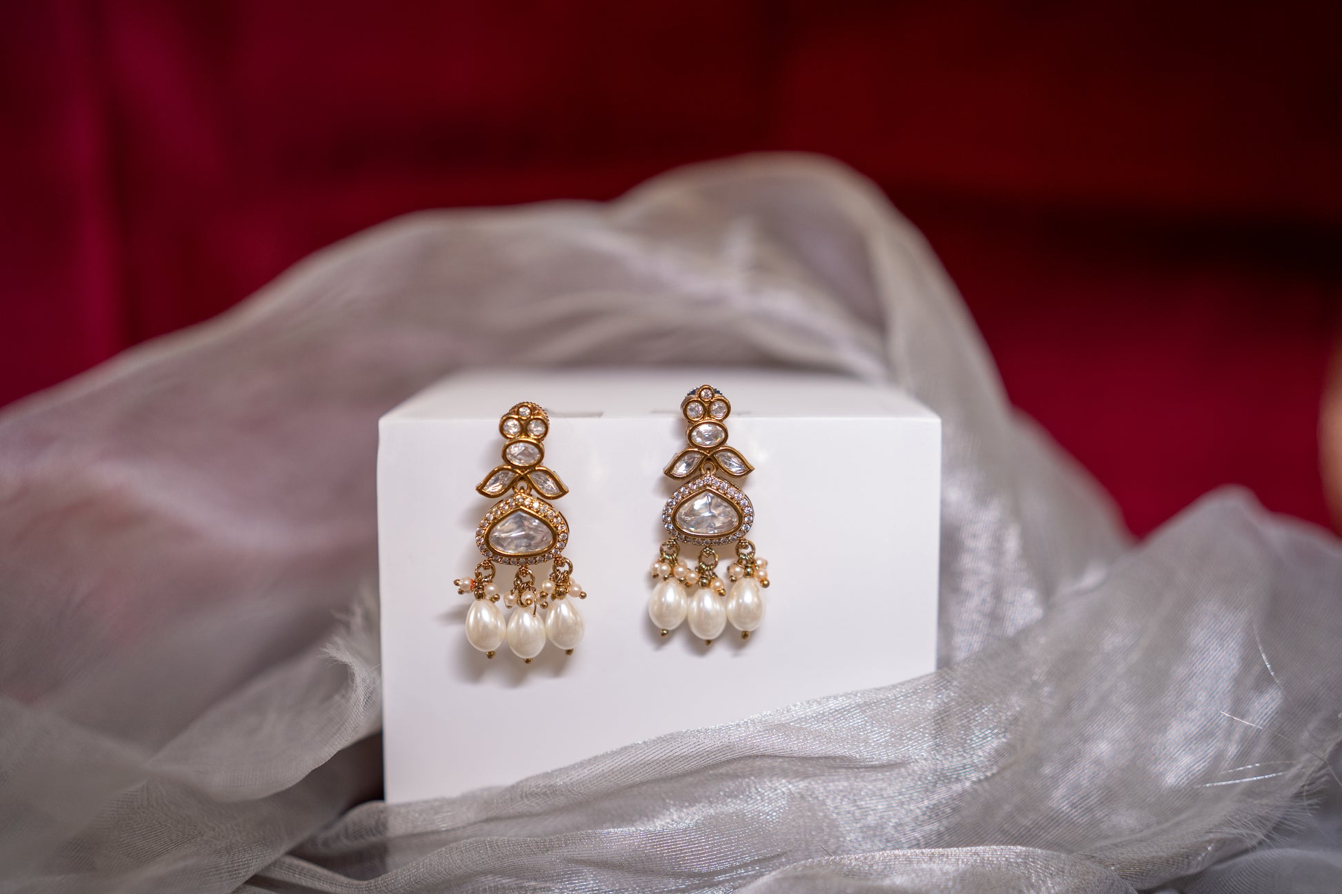 Discover the epitome of Indian craftsmanship and design with these chandelier earrings featuring a gold finish. Crafted with two elegant styles of polki stones and dual sized pearls, these earrings exude a delicate and traditional charm. Elevate your style with these versatile earrings, perfect for a daytime brunch or an evening of traditional Indian gathering.