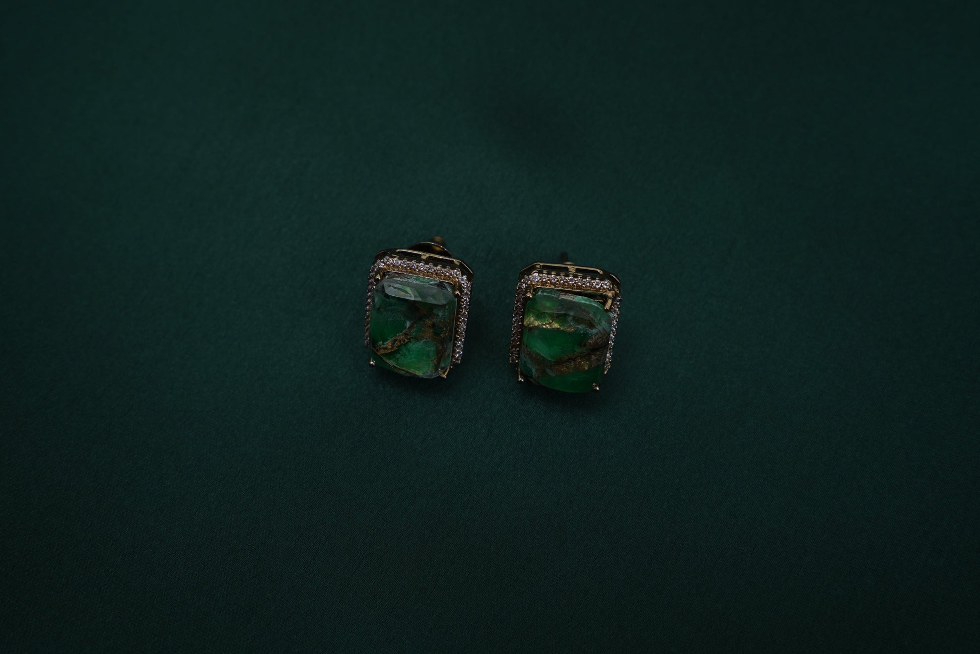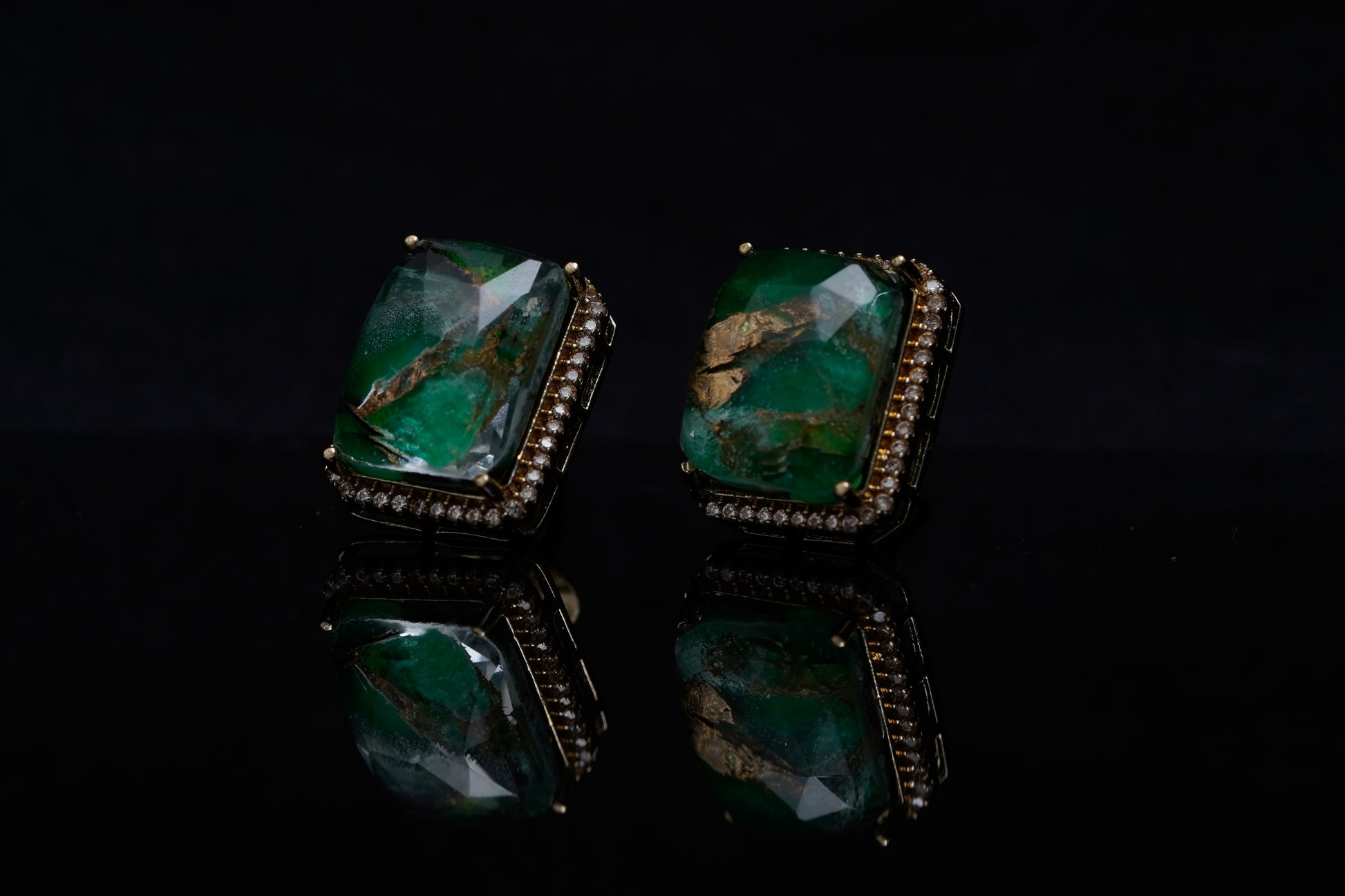 If you like your jewellery to.be unique, breathtaking, you will find our Iris enchanting green ear studs a perfect piece for you. These ear studs are made of variegated blue stone lovingly encased in american diamonds finished in a luxurious gold finish. These are truly unique, statement making piece of jewellery showcasing Indian craftsmaship. Pair them with a power dressing or an elegant saree or even a simpler outfit to make a statement that embodies you.