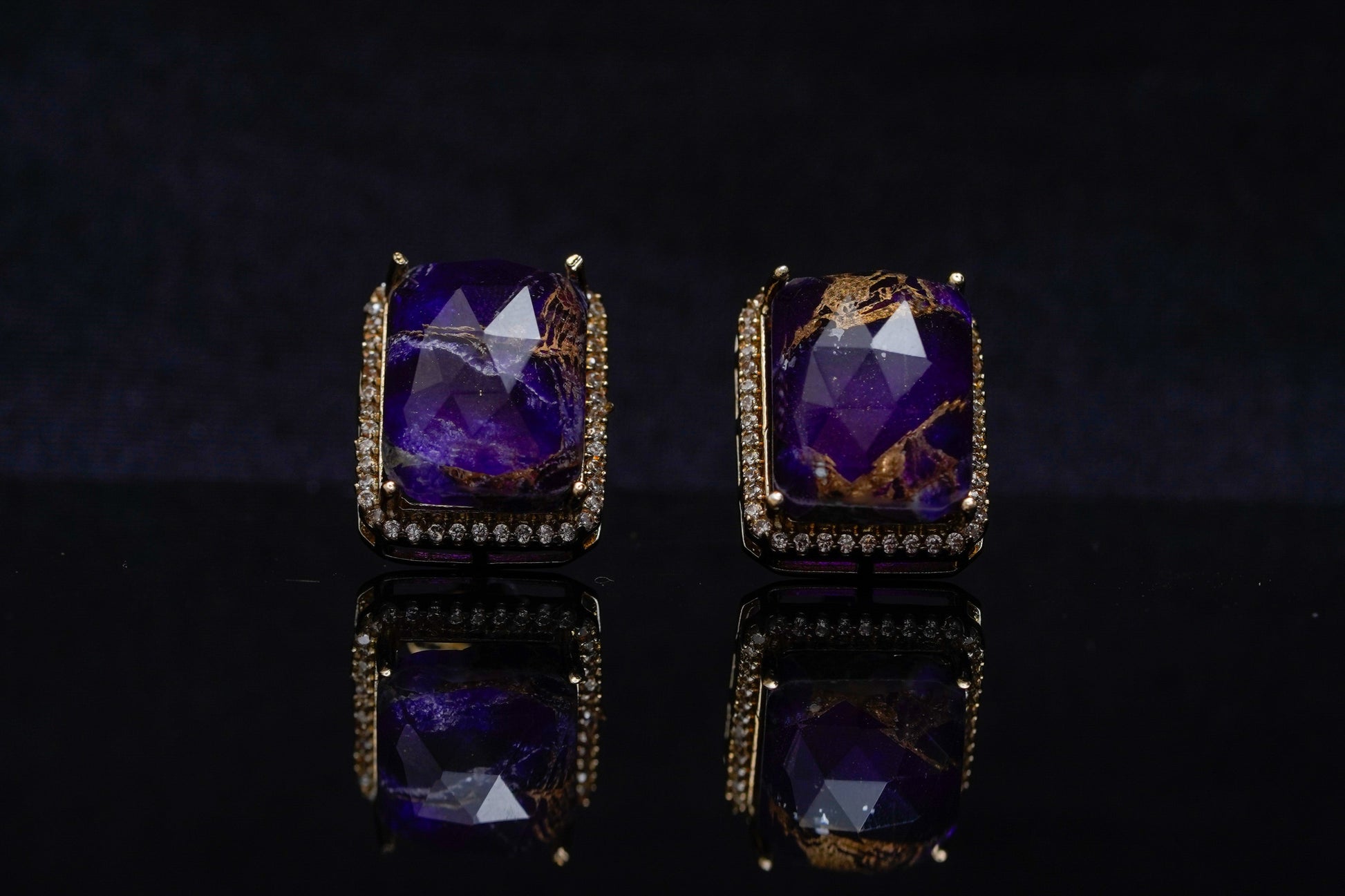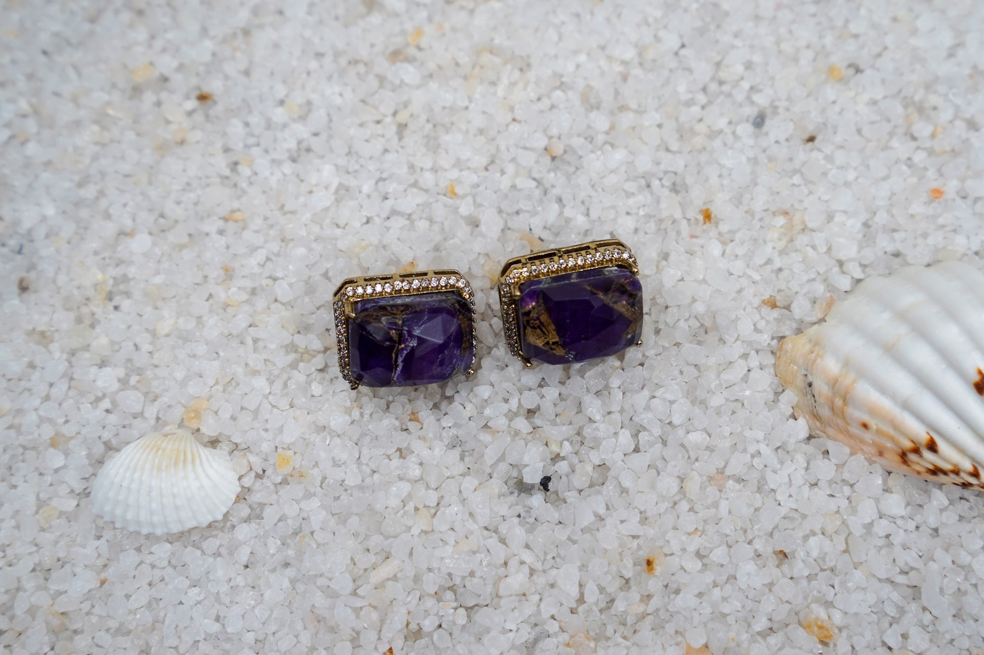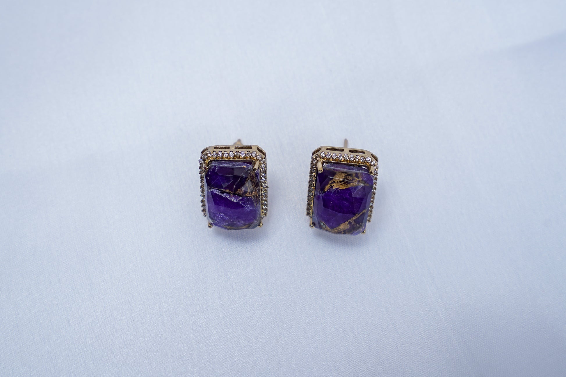 If you like your jewellery to.be unique, breathtaking, you will find our Iris enchanting purple ear studs a perfect piece for you. These ear studs are made of variegated blue stone lovingly encased in american diamonds finished in a luxurious gold finish. These are truly unique, statement making piece of jewellery showcasing Indian craftsmaship. Pair them with a power dressing or an elegant saree or even a simpler outfit to make a statement that embodies you.