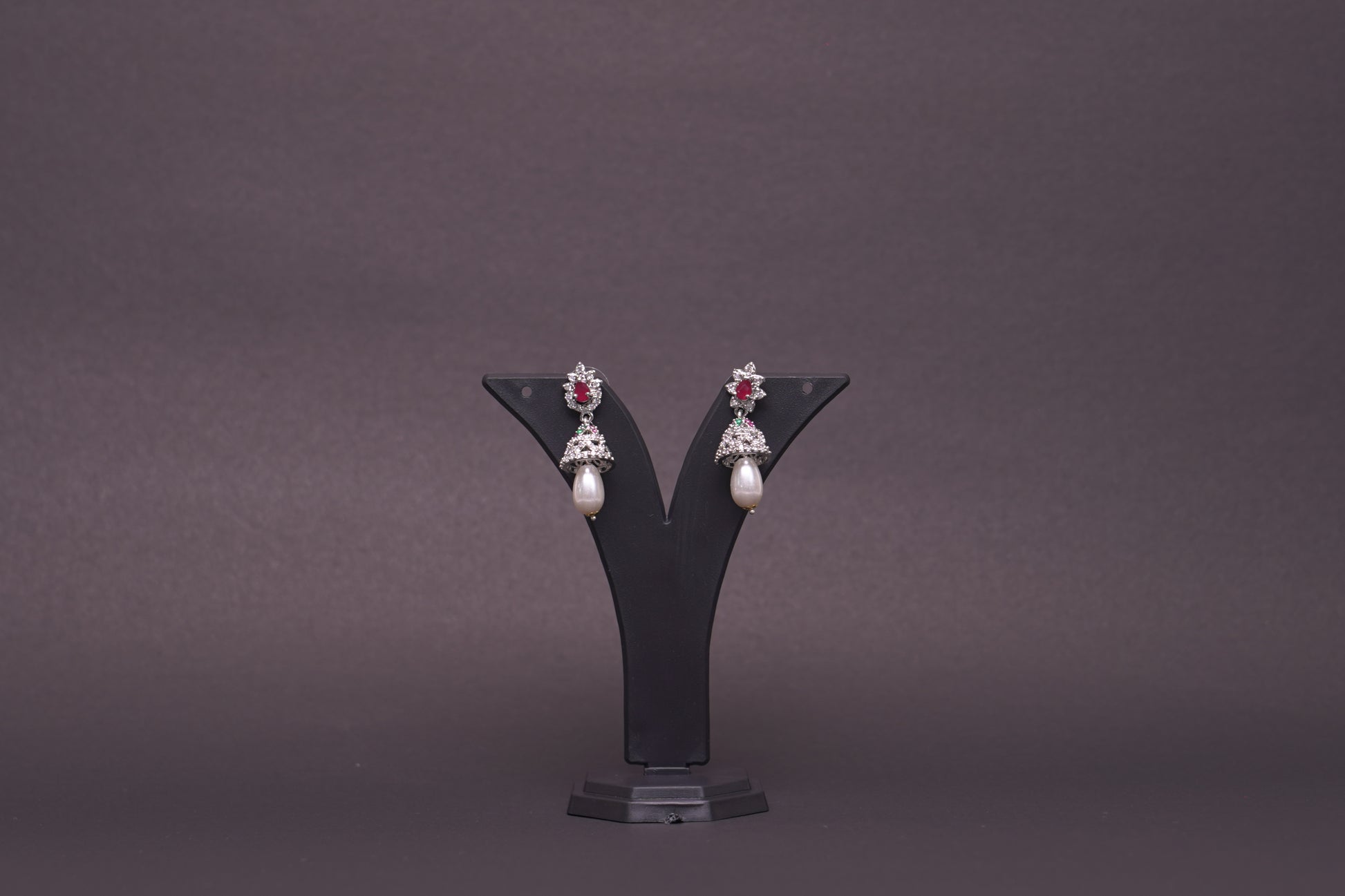 Crafted with genuine American diamonds and expertly adorned with pearls and red ruby stones, these intricate jhumkas exude timeless elegance. Their exquisite design and contrasting colours are sure to make a statement in any setting.