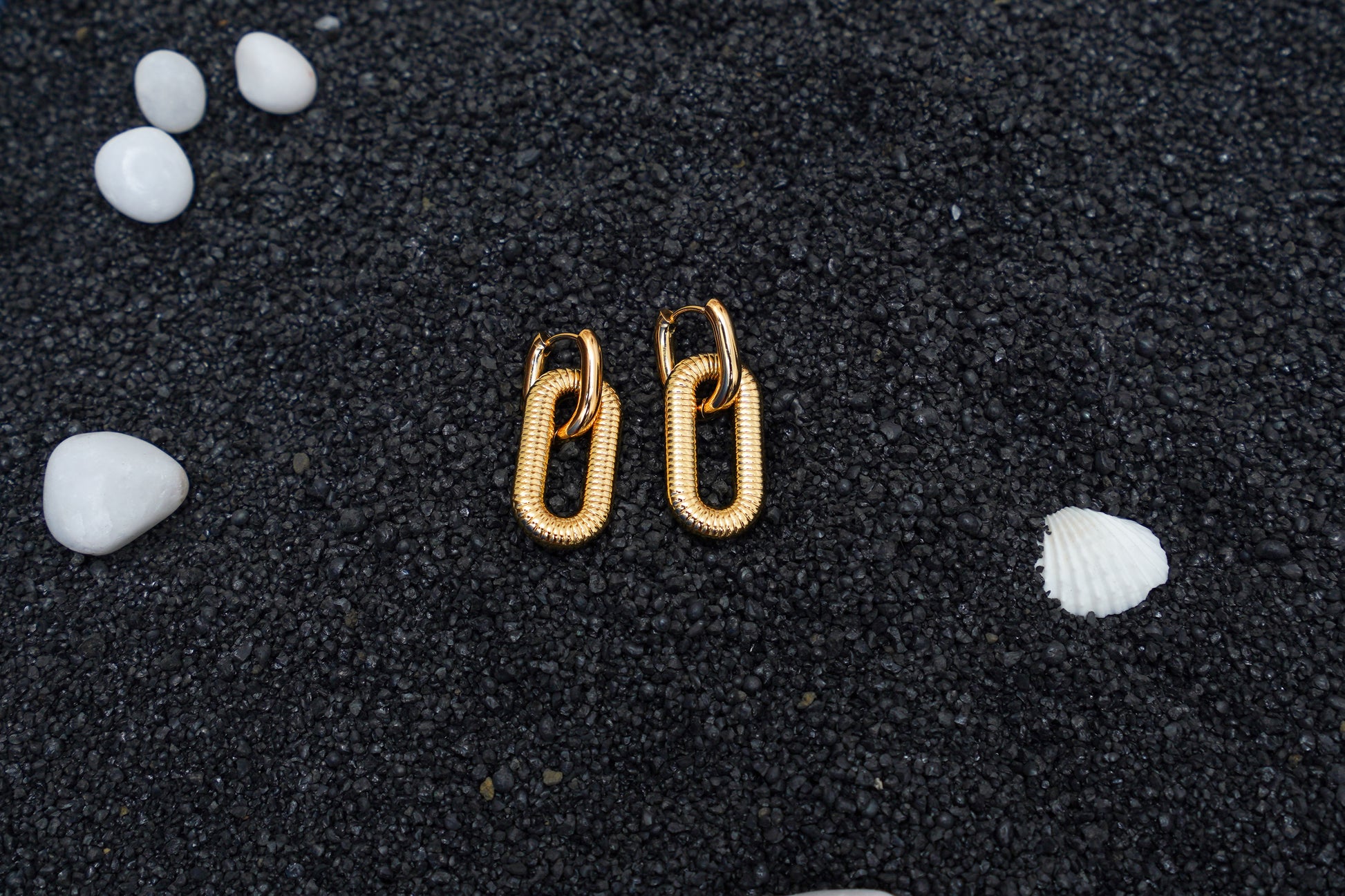 Our Mireya linked dangler earrings feature a unique chain lock design, made of stainless steel, and accented with anti-tranish gold finish. These are modern and sophisticated pair of earrings which are sure to add a touch of flair of elegance to any outfit you choose to pair these versatile earrings with.