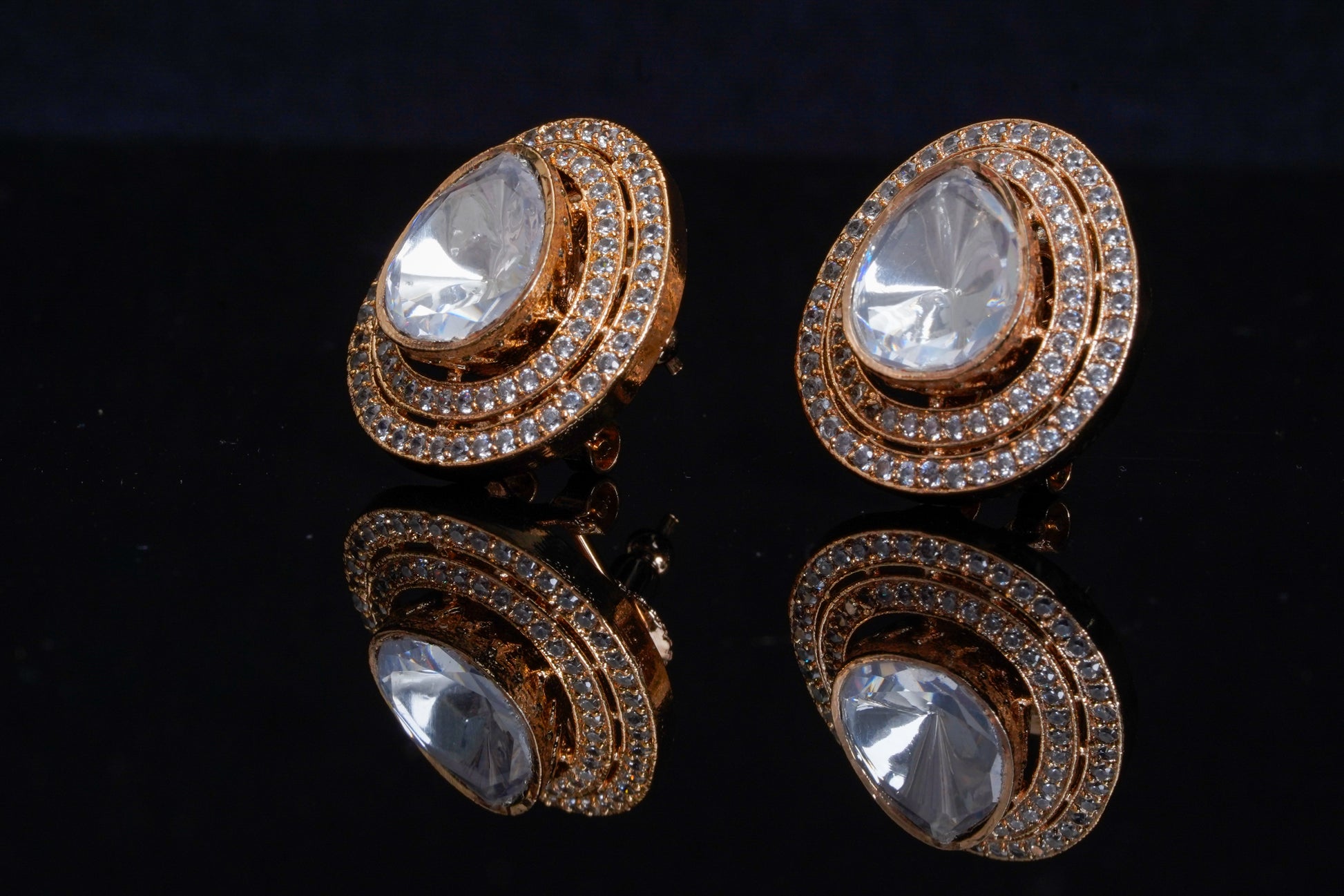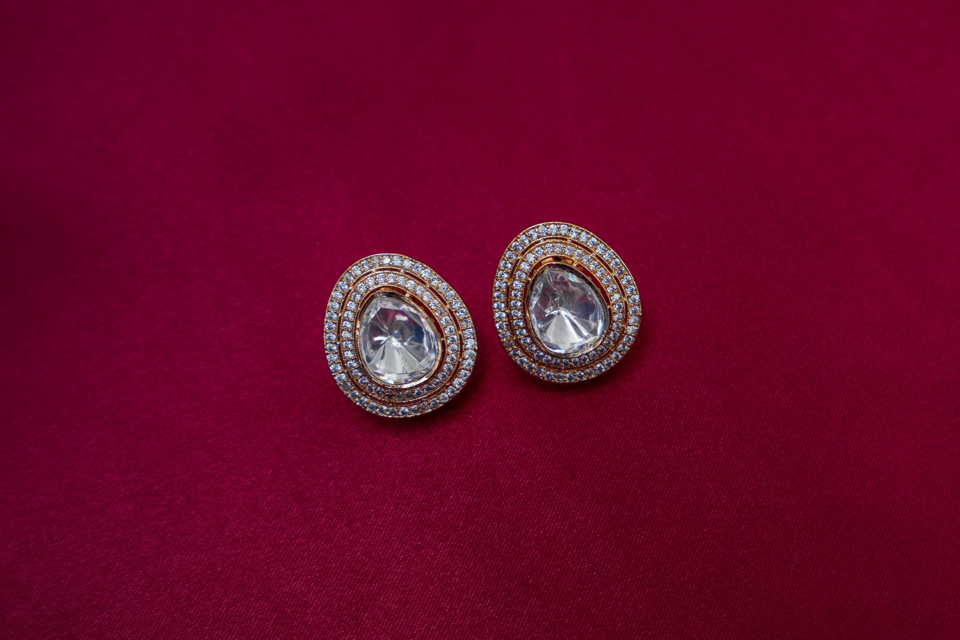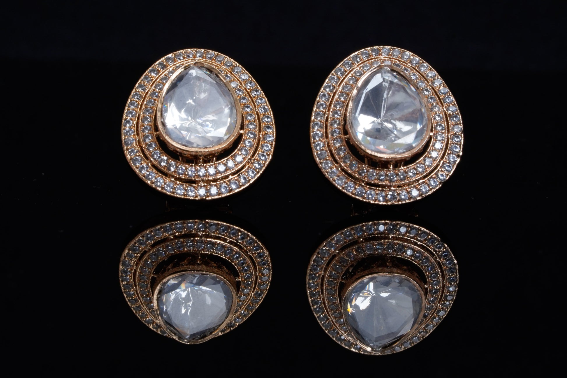 Our Noorika large ear studs made with a massive tear drop stone polki in the centre with double lines of american diamonds is both luxurious and ornate. It incorporates traditional Indian design elements and resembles the natural beauty of clear uncut stones. These stone polki tops are crafted with a stunning gold-plated finish for a luxurious and timeless look. You will make a statement with these ear studs, it is an accessory that can be worn for special occasions, events or even everyday.