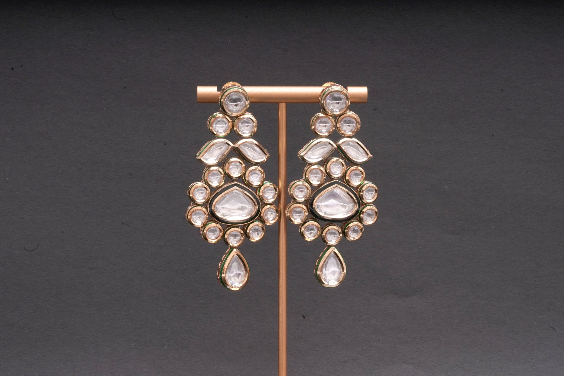 Our polki chandelier earrings made with stone polki and meenakari work at the back, add a touch of quintessential old world Indian glamour to any look. The delicate interplay of light is what makes these earrings truly stunning. You can pair these earrings with any outfit to add a touch of glamour and style.