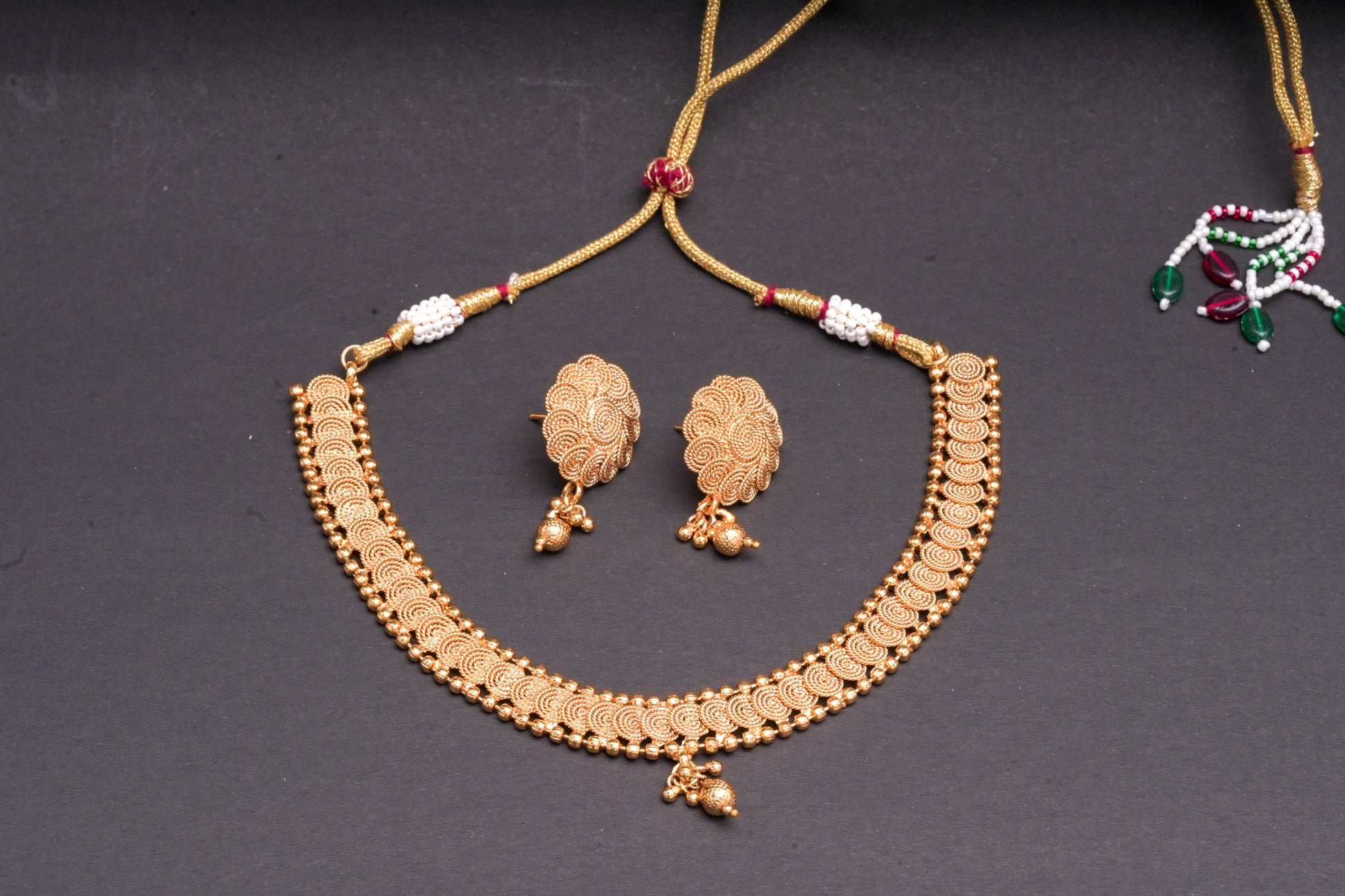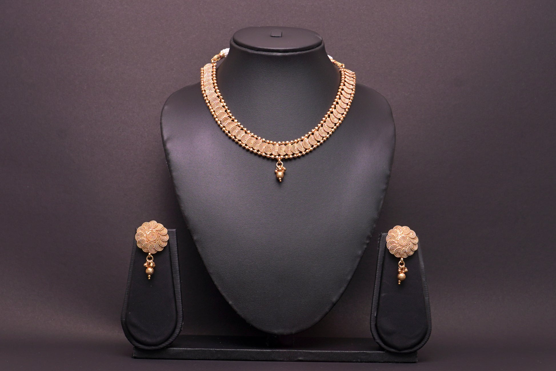 Our antique gold finish necklace set created in an impeccable symmetry features intricate flowers exuding an old world charm paired with stunning, matching earrings. Trends keep changing but the traditional designs are always in style. This glorious gold necklace is one such beauty.